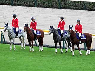 本日の 誘導馬。 メインレースを担当したのは 昨日と同じく シュガーヒル、 ショウナンライズ、 マイネルラクリマ、 サトノソルタスでした。 |