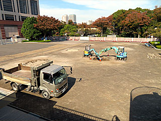 メモリアルスタンドの東、 日吉が丘との間にある広場。 「やなぎ」や 「戸松」が営業していた建物が 昨夏に撤去され、 9月には樹木も伐採されていましたが、再び広場全体が工事柵で囲われ、重機が入っていました。 樹木伐採後も残っていた花壇が撤去されていましたが、そのための工事柵? それとも何らか大規模な工事を行う? |