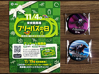 今日は「 東京競馬場フリーパスの日」ということで入場無料! フリーパスの日はコロナ禍で中止されていたため、 2019年春以来の設定となります。 そしてフリーパスの日イベントの一環として、先着30000人に「 インビテーションカード」「 イクイノックス缶バッジ」「 ヴェラアズール缶バッジ」が配布されました。 インビテーションカードにはアンケートサイトにアクセスするQRコードが印字されており、アンケートに回答すると抽選会に参加できるという企画もありましたが、自分はハズレで何も貰えず。 また、 インビテーションカードを持って 11/19(日)に再来場すると、再び抽選会に参加できるとのこと。 ちなみに 2019年までは別途「 女性フリーパスの日」というのもありましたが、今年、こちらは設定されませんでした。 |
