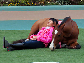 最終レース終了後、パドックで「 ファンタジックホースショー」が行われました。 演者はいつもの アクロバットデマッサとJRA工藤職員です。 |