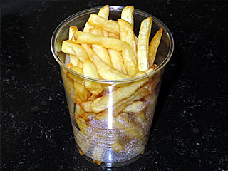 食後、さらに フジビュースタンド2Fの 「ホースアイ」へ。 「 フライドポテト」を注文。 透明プラカップで提供される細身のフライドポテト。 店頭にケチャップも用意されているのでお好みで。 |
