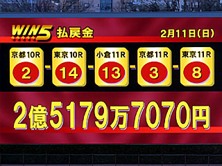 ちなみに今日の WIN5は11-6-5-3-4番人気の決着となり、的中2票で2億5179万7070円と大荒れの結果に。 払戻金が億超えとなるのは昨年9/24以来で通算40回目。 |