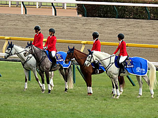 メインレースの 誘導馬。 今日は ハヤブサナンデクン、 サトノソルタス、 マイネルラクリマ、 シークレットパスの4頭が務めていました。 |