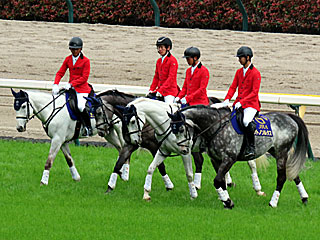 メインレースの 誘導馬。 今日は ミライヘノツバサ、 オメガブルーム、 レンディル、 サトノソルタスの4頭が務めていました。 |