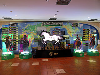 フジビュースタンド3Fでは「 HERO'S DECORATION」と題した展示が始まりました。 オルフェーヴル、 コントレイル、 アーモンドアイ、 ディープインパクトの巨大なアクリルスタンドを設置し、馬のかたちをしたモニターに過去のGⅠレースの映像が流されていました。 |