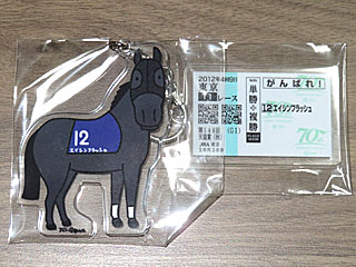 さらに「 Welcomeチャンス!」にチャレンジしたところ、自分はハズレてしまったが、今日は知人4人と来ていて、その知人がD賞に当選! 「メモリアルヒーローアクリルキーホルダー」を貰う。 デザインはランダムで配布され、貰ったのは エイシンフラッシュ。 |