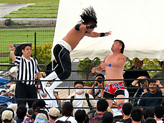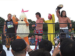昼休み、 ステージエリアで「 青空プロレス」が行われていたので観戦。 競馬場で 青空プロレスというのも珍しい。 レスラーは ランズエンドプロレスリングの 崔領二、 大門寺崇、 最上九、 坦々麺造、 エビ天くんとのこと。 |  |  |