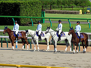 本日の 誘導馬。 メインレースを担当したのは マイネルラクリマ、 レンディル、 ハヤブサナンデクン、 デルマラピスラズリでした。 |