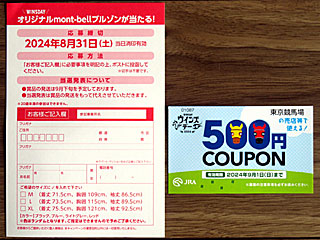 まずは 昨日と同じく「 ウインズデーUMACAでおトクな大抽選会」に参戦! 結果、これまた昨日と同じくC賞が当選し、Wチャンス応募ハガキと500円分の飲食クーポンをもらう。 |