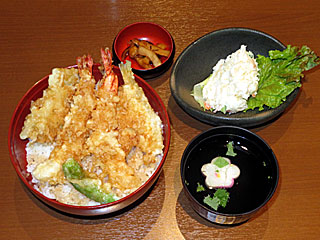 昼メシは フジビュースタンド5Fの 「鳥駒」へ。 「 天丼」と「 ポテトサラダ」を注文。 海老天2本、キス天2本、シシトウ天で、王道の天丼という感じでおいしい! また、ポテトサラダは普通にポテサラ。 |