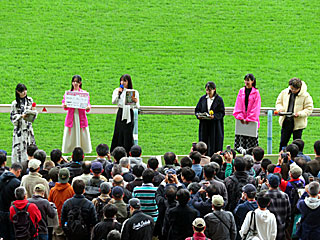 昼休み、ゴール前特設ステージで「 東スポ競馬Web予想検討会」と題したトークショーが行われました。 出演は 朝日奈ゆうさん、 豊島心桜さん、 三嶋まりえさん、 藤井真俊さんとのこと。 |