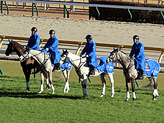 また、メインレースの 誘導馬。 今日は デルマラピスラズリ、 ハナビマンカイ、 ミライヘノツバサ、 サトノソルタスの4頭が務めていました。 |