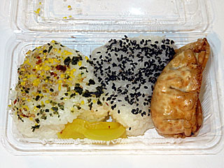 今開催、北フードコートに新しく「 東スポ食堂」というお店がオープンしたとのことで早速利用してみる。 「 満腹おにぎょ」600円。 のりたまおにぎり+ごまおにぎり+東スポ揚げ餃子2個+たくあん。 おにぎりは特別なものではなく、 東スポ揚げ餃子は Twodaysでも売っているので、特に珍しさはないかなぁ… |  |  |