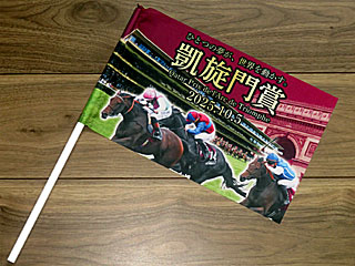夜、 凱旋門賞パブリックビューイングを見に再び 東京競馬場へ。 凱旋門賞パブリックビューイングは 2年連続の実施となりました。 21:00の開門時点で多くの人が並んでおり、最終的には約7900人が集まったとのこと。 まずは入口にて、先着5000人に配布された 凱旋門賞応援フラッグを貰う。 |  |  |