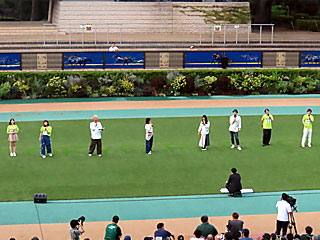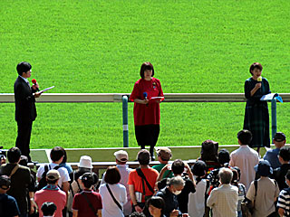 昼休み、ゴール前特設ステージで 毎年恒例の「 ばんえいトークショー」が行われました。 出演は 定政紀宏さん、 荘司典子さん、 目黒貴子さん。 |