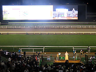 21:30頃から「 凱旋門賞レース直前ステージトークショー」が行われました。 出演は 芥田愛菜美さん、 稲村亜美さん、 木村拓人さん。 |