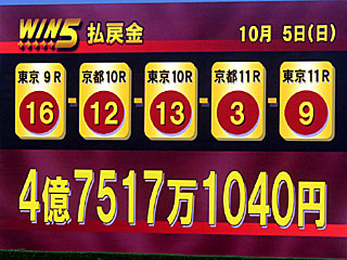 そして今日の WIN5は16-4-8-5-5番人気という決着で、的中4票の4億7517万1040円という結果に! |