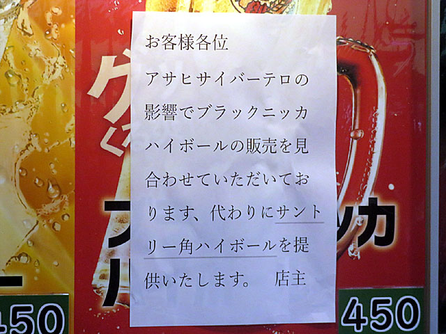 9/29より アサヒグループHDがサイバー攻撃を受け、現在でも飲料の出荷に遅れが出ているとのこと。 そのため、アサヒの商品を扱う場内飲食店で、一部商品が販売中止となっていました。 |