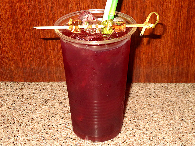今度は フジビュースタンド3Fの 「BAR2400@TOKYO」へ。 2025年版の「 天皇賞秋オリジナルカクテル」を注文。 赤ワイン+白ぶどうリキュール+ぶどうジュース+寒天ゼリーとのこと。 昨年の優勝馬 ドウデュース≒ぶどうジュースにかけているらしい。 |