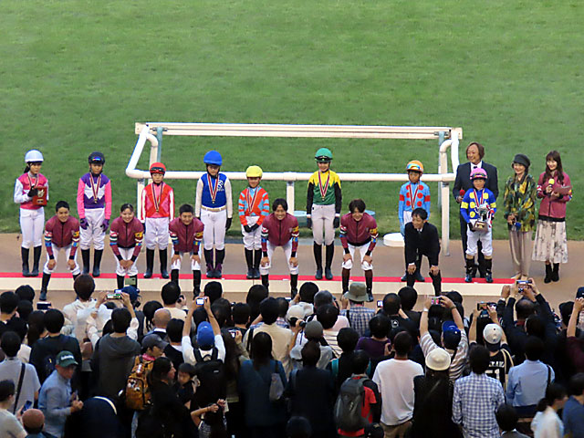 そして最終レース終了後、 全国ポニー競馬選手権「第14回 ジョッキーベイビーズ」が開催されました。 16:45頃に発走し、勝ったのは北海道地区代表の 八嶋駿吏くん& ユリ。 新潟千直?エイシンヒカリ?みたいに外ラチいっぱい! また、敢闘賞は沖縄地区代表の 金城唯さんが受賞。 |