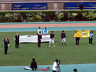 そして最終レース終了後、パドックにて「 サンクスホースデイズトークショー&チャリティーオークション」が行われました。 オークション出品者として登場したのは、 角居勝彦元調教師、 北村宏司騎手、 大野拓弥騎手、 野中悠太郎騎手。 |