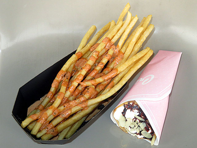 食後に 内馬場の 「M'sケバブ」へ。 「 ロングポテトケバブソース」と「 クレープアーモンドチョコホイップ」を注文。 ロングポテトは何度も食べているが、サクサクでやっぱりおいしいし、ケバブソースとも意外と相性良い気も。 クレープは甘く、アーモンドスライスがよいアクセントになっておいしい! |
