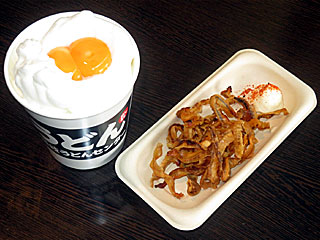 朝メシは 「讃岐うどんセンター」へ。 「 たまだくうどん」と「 焼ほたて貝ひも」を注文。 メレンゲの上に黄身を載せたうどんというのは過去に見たことないビジュアル! 全体的にふんわりしたうどんでウマい! 焼ほたて貝ひもは普通に貝ひもだが、七味マヨと相性が良くこちらもウマい! |