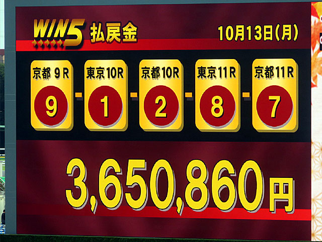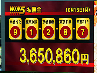 ちなみに今日の WIN5は3-2-1-13-5番人気の決着で、払戻金は365万860円となりました。 3日連続の100万円超! |
