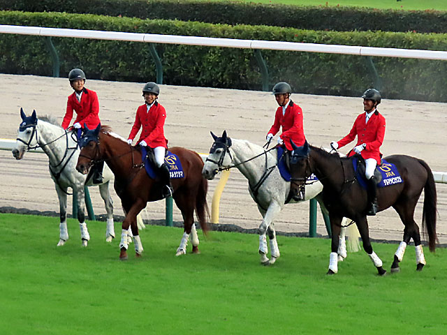 メインレースの 誘導馬。 今日は ハナビマンカイ、 マイネルラクリマ、 シュガーヒル、 デルマラピスラズリが務めていました。 |