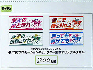 ちなみに「 Welcomeチャンス!」は今日から特別版。 10/18~11/2の期間中、JRAのCMに出演している4人が監修したオリジナルタオルが合計1300人に当たるというもの。 しかし、残念ながらハズレ… |