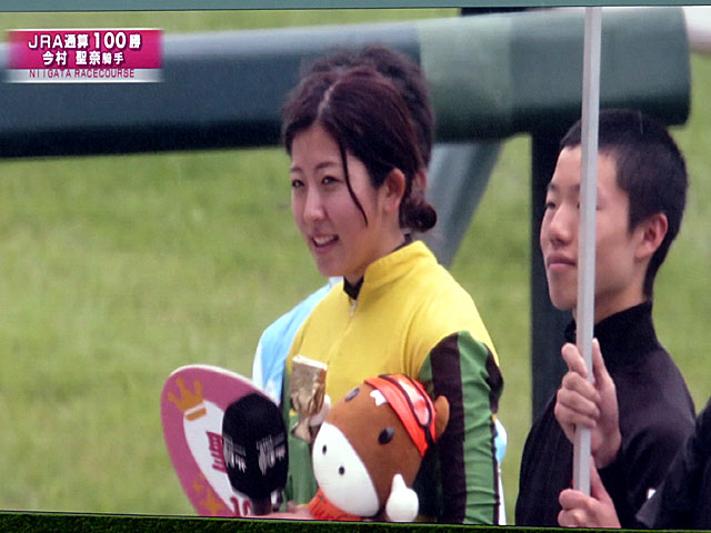 本日の新潟3Rで、12番人気の インフローレが優勝。 その結果、鞍上の 今村聖奈騎手がJRA通算100勝を達成しました! 女性騎手としては 藤田菜七子、 永島まなみに続く史上3人目。 9/28にJRA通算99勝となり、先週、先々週と東京競馬場でも騎乗していたので、達成の瞬間を生で見られるかなぁと密かに期待していたが。 |