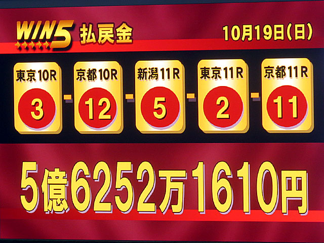 ちなみに今日の WIN5は10-14-1-9-2番人気の決着で的中1票。 歴代高配当1位となる5億6252万1610円を記録しました! |