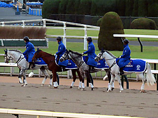 メインレースの 誘導馬。 今日は ハナビマンカイ、 マイネルラクリマ、 サトノソルタス、 サクセスミノルが務めていました。 |