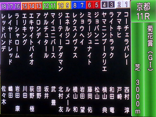 そして京都ではGⅠ菊花賞。芝3000m。今年はGⅠ馬不在で、春のクラシックで掲示板に載った馬も皐月賞4着ジョバンニ、日本ダービー3着ショウヘイ、同5着エリキングの3頭のみ。 結果、勝ったのは1番人気エネルジコ。 青葉賞を勝ち、日本ダービーには出走せず、新潟記念2着からここへ挑みGⅠ初制覇。 ドゥラメンテ産駒で、鞍上はC.ルメール騎手。