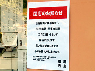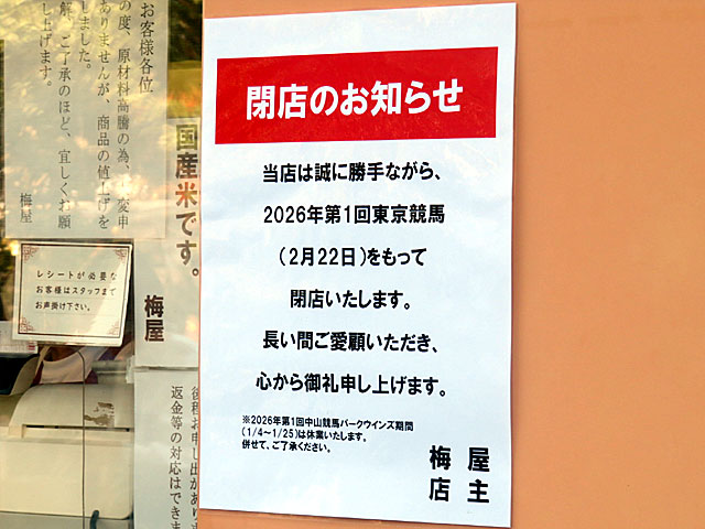 東京競馬場老舗店のひとつ「梅屋」ですが、来年の第1回東京開催をもって閉店とのこと。場内に最大4店舗ありましたが、2022年にフジビュースタンド1F中央店、2023年にフジビュースタンド3F店が閉店し、現在残っているのはフジビュースタンド1Fファストフードプラザ店とフジビュースタンド2F店の2店舗のみ。 その2店舗と中山競馬場の店舗も合わせ、競馬場からは全て撤退するようです。 | ||||||||||||||||||||||||||||||||||||||||||||||||||||||||||||||||||||||||||||||||||||||||||||||||||||||||||||||||||||||||||||||||||||||||||||||||||||||||||||