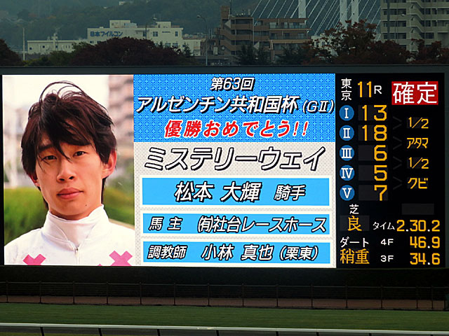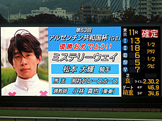 東京11RはGⅡ アルゼンチン共和国杯。芝2500m。 勝ったのは9番人気 ミステリーウェイ。逃げ切り。 ジャスタウェイ産駒の7歳せん馬で、鞍上は 松本大輝騎手。 人馬ともに重賞初制覇! |