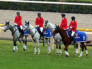 メインレースの 誘導馬。 今日は サトノソルタス、 サクセスミノル、 シフルマン、 マイネルラクリマが務めていました。 |