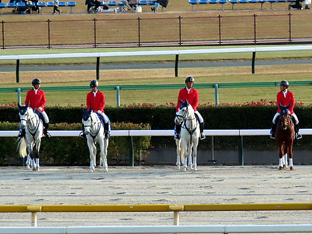 メインレースの 誘導馬。 今日は ハナビマンカイ、 タケルペガサス、 サクセスミノル、 マイネルラクリマが務めていました。 |