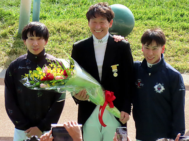 横山典弘騎手が今年の黄綬褒章を受章したことから、昼休みに記念セレモニーが行われました。黄綬褒章を受章するJRA騎手は柴田善臣騎手、武豊騎手に次いで3人目。 花束贈呈で登場したのは横山和生騎手と横山武史騎手!