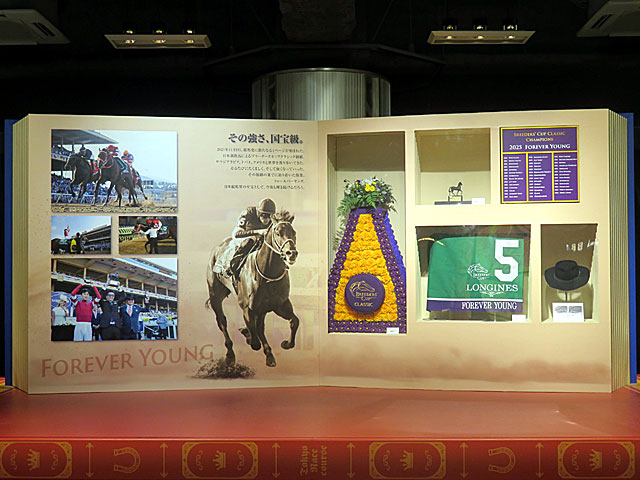 センターコートでは「フォーエバーヤングブリーダーズカップクラシック優勝記念展示」が始まりました。昨秋に「イクイノックス顕彰馬選定記念展示」を行っていましたが、開催終了後も台座がそのまま残されていたため、また何かやるんだろうなぁとは思っていましたが。 間近でブリーダーズカップクラシック優勝トロフィーを見られるというのも早々ないことで非常に貴重な機会!