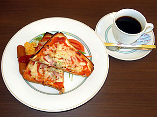 朝メシは メモリアルスタンド3Fの 「ニユートーキヨー」へ。 「 モーニングセット」を注文。 ピザトーストに、ソーセージ、スクランブルエッグ、サラダ。 セットのドリンクはホットコーヒーまたはアイスコーヒーとのことでホットコーヒーにしてみる。 王道のモーニングセットという感じ! |