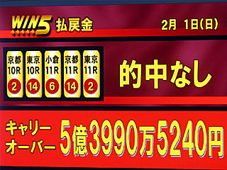ちなみに今日の WIN5は7-2-5-16-6番人気の決着となり、昨年 10/4以来の的中なし! 5億3990万5240円が 来週へキャリーオーバーとなりました。 |