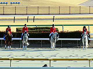 メインレースの 誘導馬。 今日は マイネルラクリマ、 ハナビマンカイ、 サクセスミノル、 ボスジラの4頭が務めていました。 |