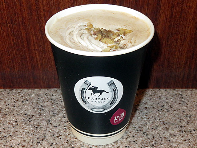 さらに フジビュースタンド3Fの 「BAR2400@TOKYO」へ。 「 フェブラリーステークスオリジナルカクテル」を注文。 今年は紫芋リキュール+ウィスキー+キャラメルカフェオレ+マロンホイップクリーム+クラッシュ甘栗+芋けんぴと、芋づくしホットカクテルとのこと。 |
