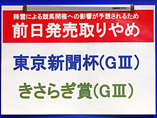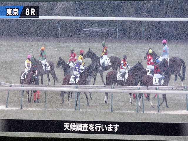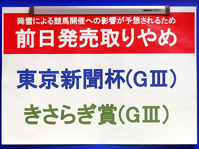 今日は全て条件戦の1日。 先週は5万人以上が詰めかけた 東京競馬場ですが、今日は朝から小雪が舞い、冷たい北風も吹いていて、最高気温も5.1℃までしか上がらず、来場客も少なめ。 なお、 明日の東京競馬、京都競馬は降雪が予想されるため、東京新聞杯、きさらぎ賞の前日発売は中止となっていました。 |