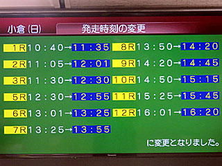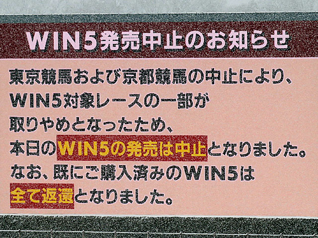 今日は昨晩から降り続いた雪の影響で、 東京競馬および 京都競馬は開催中止となりました。 また、同時開催の小倉競馬は障害4Rを中止とし、全体的に発走時刻を繰り下げて開催が行われました。 競馬開催が中止となるのは 昨年2/8の京都競馬以来、ちょうど1年ぶり。 なお、 先週から5億3990万5240円のキャリーオーバーが発生している WIN5は、さらに来週へ持ち越しとなっています。 |