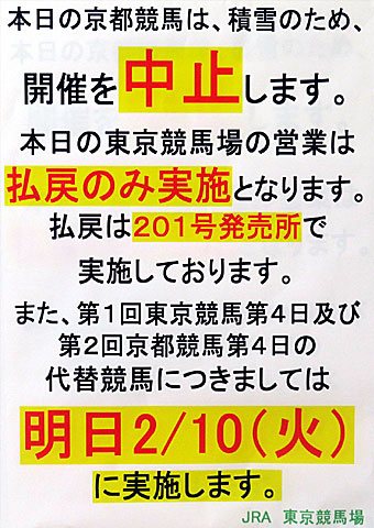 に雪のため中止となった東京競馬、京都競馬は、ともに明日へ順延となっています。