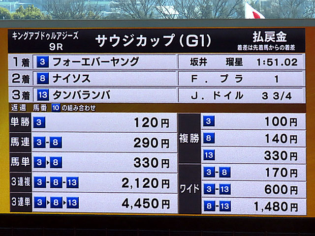 結果、G1サウジカップで世界のダート王者フォーエバーヤングが完勝! 史上初のサウジカップ連覇となり、一昨年にサウジダービーも制しているのでサウジ3連覇! GⅠJpnⅠは2023年全日空2歳優駿、2024年JDC、東京大賞典、2025年サウジC、BCクラシックに続き6勝目となりました! 次走のドバイワールドカップも楽しみ! なお、他レースの結果は以下の通り。 ■3R:G3 サウジダービー:ダート1600m └3着:サトノボヤージュ(戸崎圭太) └4着:ワンダーディーン(O.マーフィー) └5着:ケイアイアギト(J.モレイラ) └12着:トウカイマシェリ(鮫島克駿) ■5R:G2 リヤドダートスプリント:ダート1200m └4着:アメリカンステージ(坂井瑠星) └6着:ガビーズシスター(J.モレイラ) └7着:ドンアミティエ(R.ムーア) └12着:ヤマニンチェルキ(岩田望来) ■6R:G2 1351ターフスプリント:芝1351m └5着:パンジャタワー(J.モレイラ) └6着:フォーチュンタイム(坂井瑠星) └13着:シンフォーエバー(戸崎圭太) ■7R:G1 ネオムターフカップ:芝2100m └4着:シンエンペラー(坂井瑠星) └5着:ヤマニンブークリエ(横山典弘) └7着:アロヒアリイ(岩田望来) ■8R:G2 レッドシーターフハンデキャップ:芝3000m └8着:シュトルーヴェ(J.モレイラ) └11着:ヴェルミセル(M.バルザローナ) ■9R:G1 サウジカップ:ダート1800m └優勝:フォーエバーヤング(坂井瑠星) └5着:ルクソールカフェ(J.モレイラ) └6着:サンライズジパング(O.マーフィー) | ||||||||||||||||||||||||||||||||||||||||||||||||||||||||||||||||||||||||||||||||||||||||||||||||||||||||||||||||||||||||||||||||||||||||||||||||||||||||||||