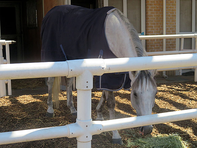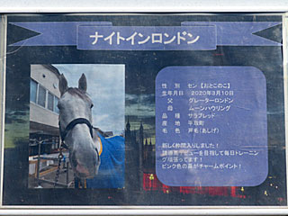 乗馬の展示コーナー。 今日は ペラ、 サファイア、 ナイトインロンドンの3頭が展示されていましたが、 ナイトインロンドンは初顔。 グレーターロンドン産駒で、先月の迎春S16着後、通算23戦3勝で引退。 |