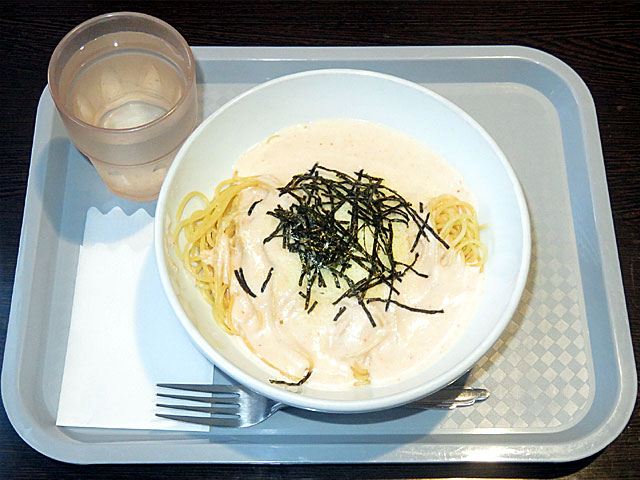 昼メシは フジビュースタンド1Fの 「ドマーニ」へ。 今冬の新メニュー「 明太子クリームパスタ」を注文。 明太子クリームたっぷり! ウマい! |